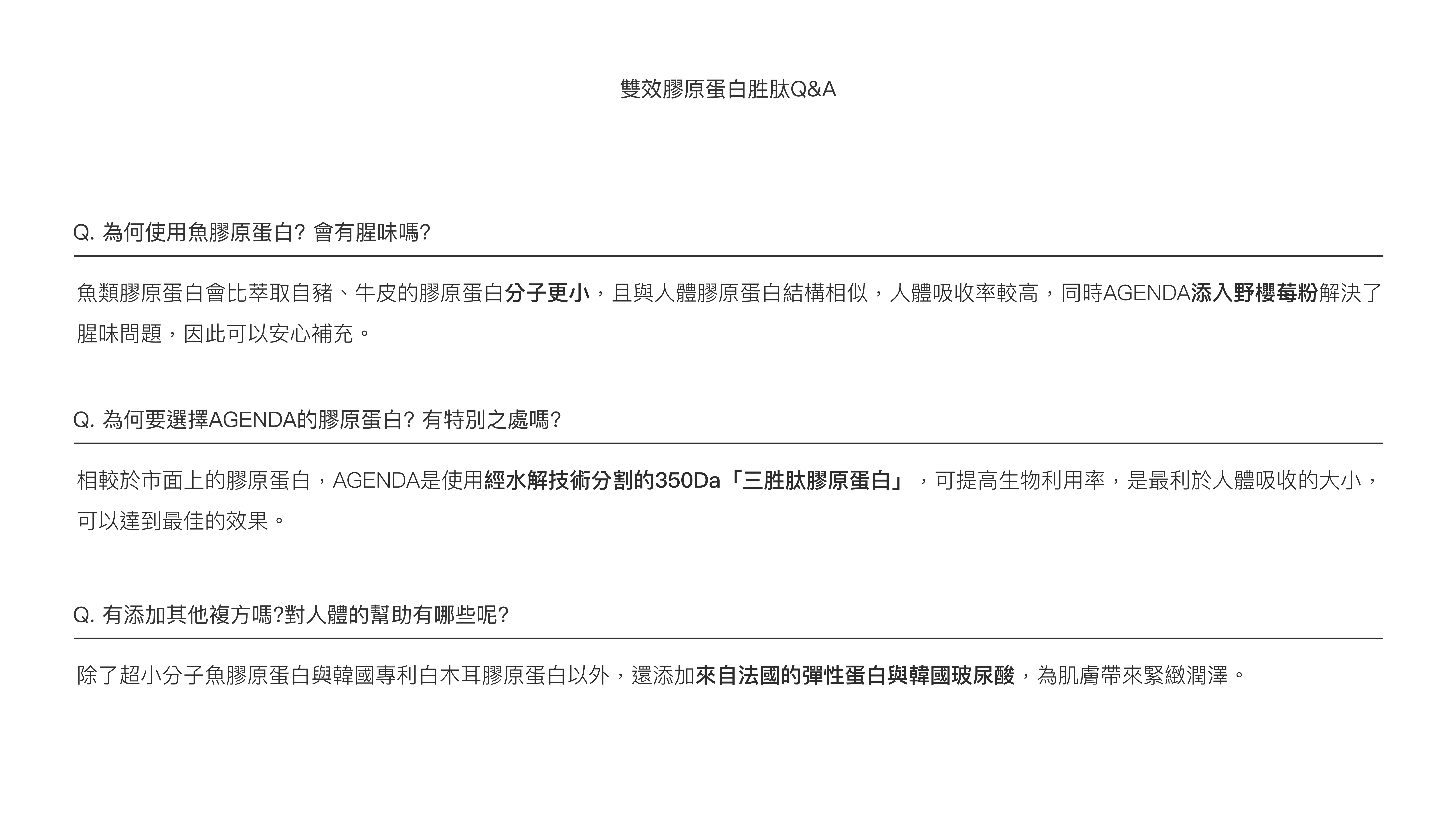 AGENDA利用水解技術將膠原分割,是目前市售中極低的分子量,可以更快速被人體吸收利用,提升肌膚緊緻度
